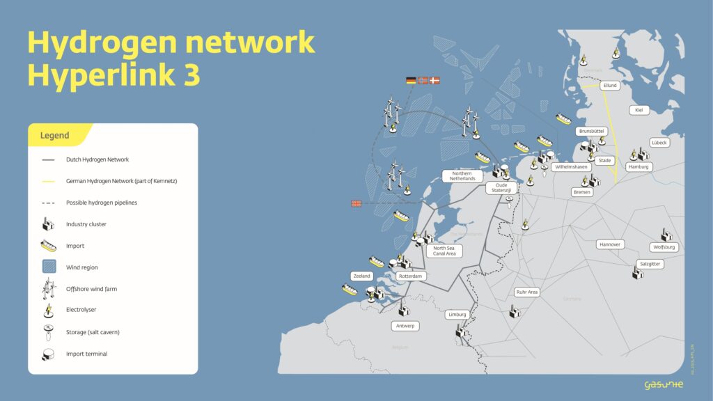 Gasunie har med Hyperlink-projektet ansvaret for omkring ti procent af den samlede længde af det brintnet, som kommer til at forbinde vigtige import-, produktions- og lagringssteder med store industriregioner og muliggør forbindelse til brintnettene i Danmark og Holland.